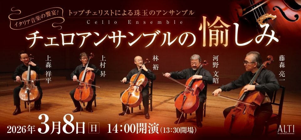 2026年3月8日(日)14:00開演 日本が誇るトップチェリスト5名による大人気のアルティ恒例企画。 【出演】上森祥平、上村 昇、林 裕、河野文昭、藤森亮一 【チケット発売日(全席指定)】アルティメイト11月29日(土)10時~/一般12月6日(土)10時~